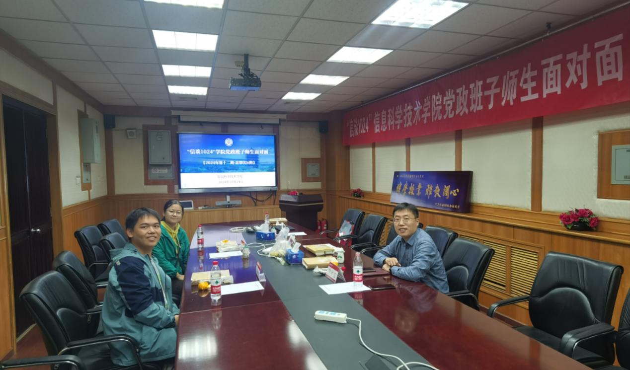 2024年10月24日中午,正值“1024程序员节”,信息科学技术学院在理科二号楼2111会议室举办2024年第十二期(总第26期)“信谈1024”学院党政班子师生面对面之港澳台及留学生专题活动,本次座谈会采取群体座谈的形式,对报名同学们的问题进行全面交流答疑解惑。学院教学副院长陆俊林、党委副书记贾方健,成功报名的学生代表们参加了本次座谈。活动由学院学工办主任李子奇主持。